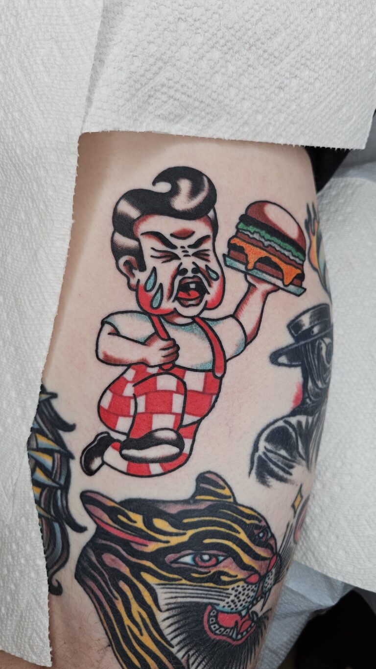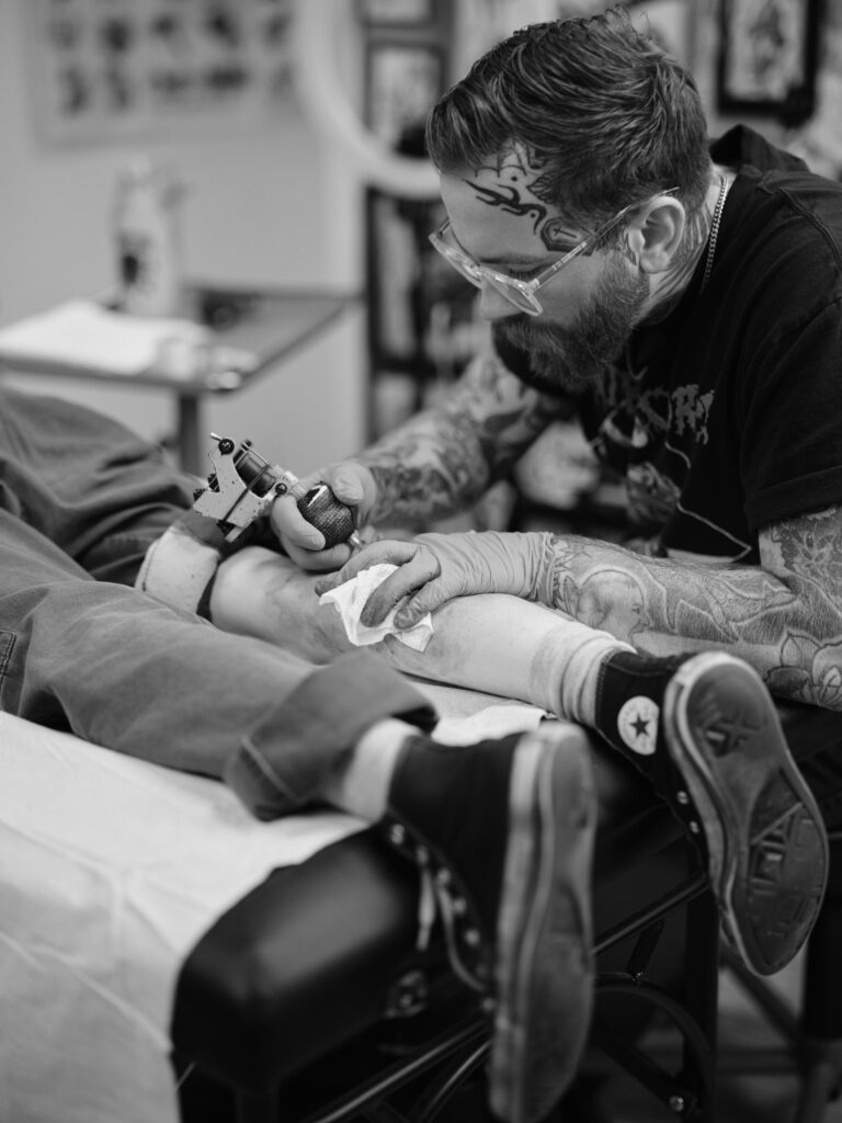 Ben has been tattooing since 2022. Inspired by the art of American Traditional tattoo roots, he prefers bold lines and bright colors, but will take almost anything that walks through the door (no realism)! Ben lives with his wife, son, and pets in southern indiana. He plays drums for a band called Parallel Colors. Enjoys film, photography, music, art, and playing pool. Email bentattoosyou@gmail.com for appointment inquiries.